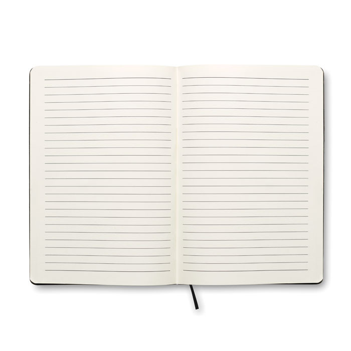A5 jegyzetfüzet puha PU borítóval. Cérnafűzött. 160 vonalas oldal (80 lap) újrahasznosított papírból. Hozzáillő elasztikus zárópánt és könyvjelző szalag. Irattartó zseb a hátsó borító belső oldalán. Tolltartó a gerincben.