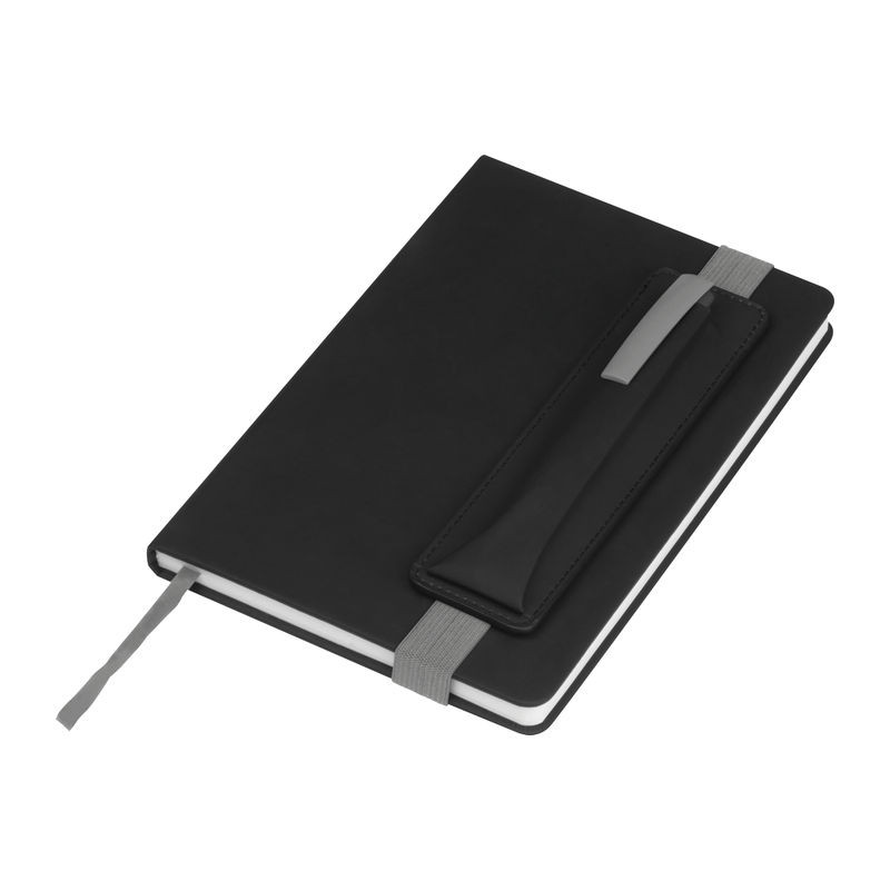 A5 méretű elegáns notesz PU borítással, 192 vonalas oldallal, könyvjelzővel és tolltartóval.