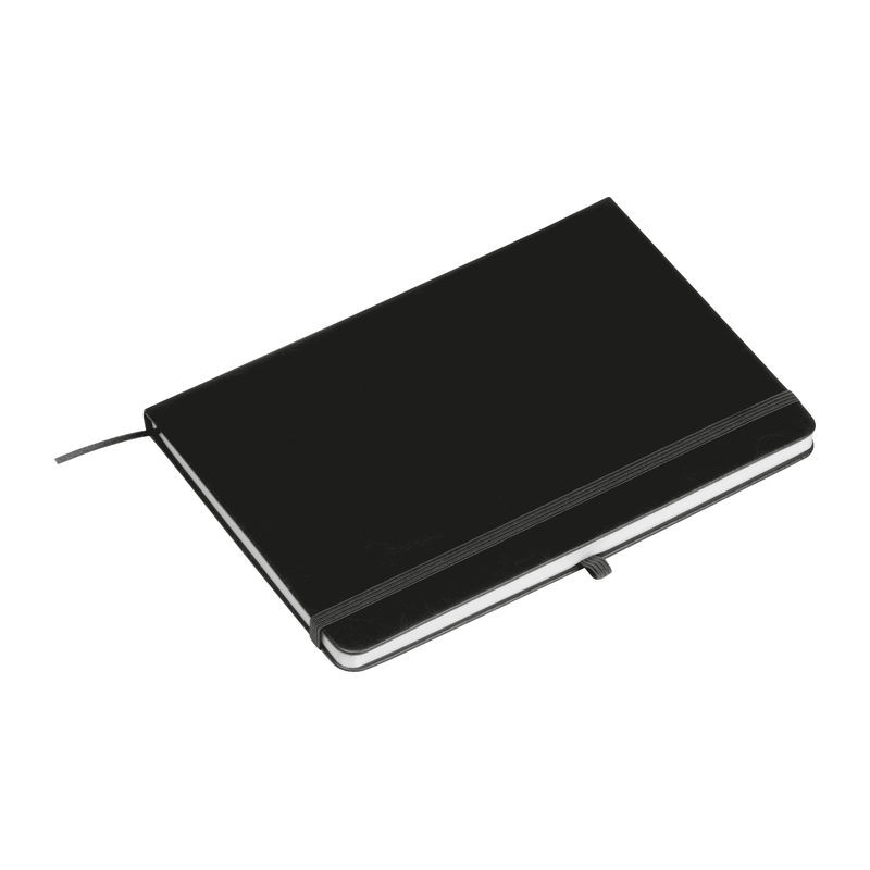 Újrahasznosított A5-ös notesz PU borítással, 192 vonalas oldallal, tolltartó hurokkal és gumipánttal a záráshoz.