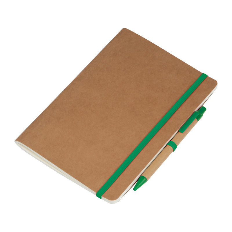 A5 notesz 120 újrahasznosított papírból készült vonalas oldallal, gumírozott pánttal, kéken író golyóstollal és tolltartó hurokkal.