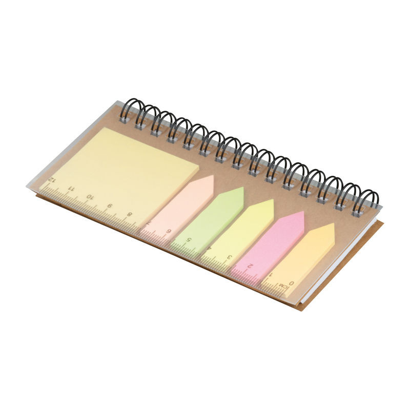Jegyzettömb különböző öntapadós jegyzetlapokkal és jelölőkkel (mindegyik 25 lapból áll), spirálos kialakítással, vonalzó szegéllyel és 80 vonalas oldallal.