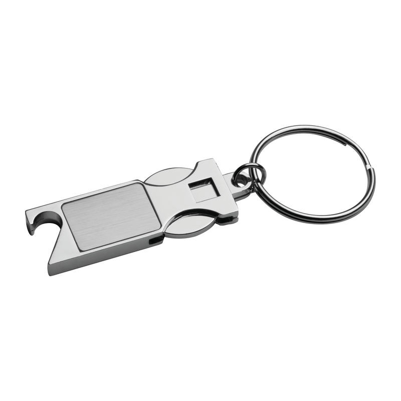 Fém kulcstartó, praktikus bevásárlókocsi érmével és sörnyitóval.