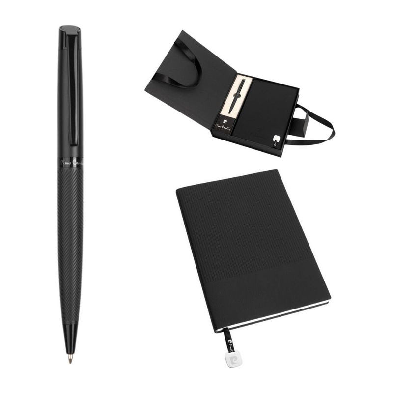Luxus Pierre Cardin notesz és DENISE golyóstoll készlet. A fekete színű notesz 160 vonalas, 80 grammos papírlapot tartalmaz, valamint egy szövet könyvjelzőt fémmedállal, amelyen a Pierre Cardin logó látható. A notesz hátulján dombornyomott Pierre Cardin logó található. A fém golyóstoll forgómechanizmussal rendelkezik, és az alsó része strukturált dizájnnal díszített. Kiváló minőségű kék betétet tartalmaz, amelynek hegye 1 mm. Díszdobozban, eredetiségi tanúsítvánnyal együtt.