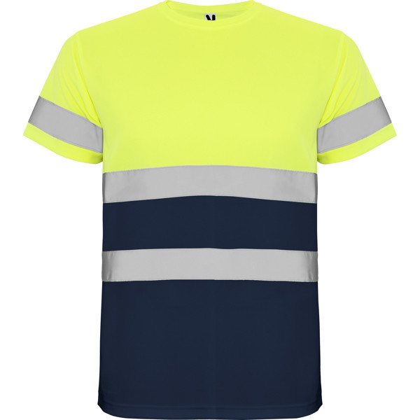 Jó láthatóságot biztosító, rövid ujjú technikai póló. Azonos szövetből készült kerek nyak, belül megerősítő varrásfedőkkel. Két vízszintes fényvisszaverő szalag a törzsön és egy az ujjakon.