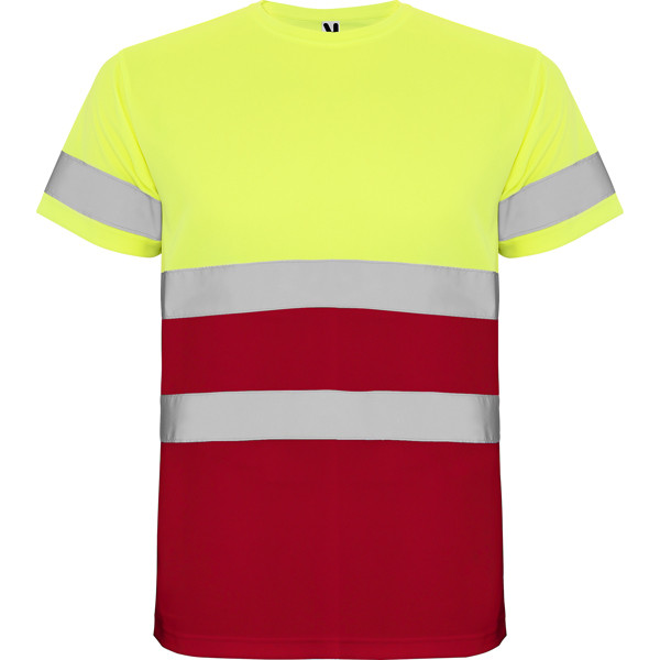 Jó láthatóságot biztosító, rövid ujjú technikai póló. Azonos szövetből készült kerek nyak, belül megerősítő varrásfedőkkel. Két vízszintes fényvisszaverő szalag a törzsön és egy az ujjakon.